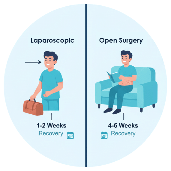 Most patients go home the same day or the next after surgery. Recovery time depends on the type of repair, but many patients return to light activities within 1–2 weeks and resume normal life in 4–6 weeks.